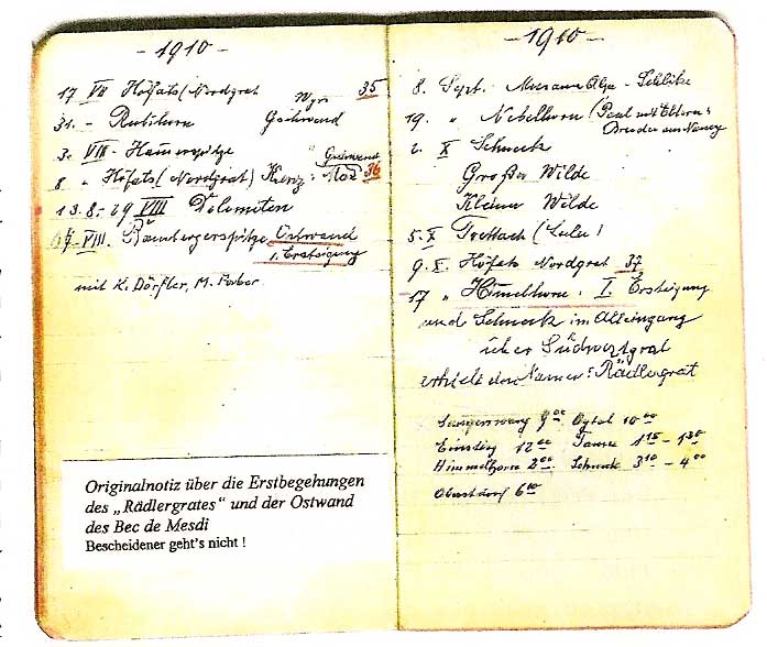 Originalnotiz über die Erstbegehung des Rädlergrates 1910: